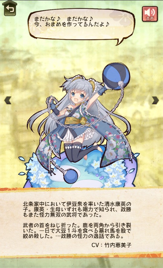 武将の首をねじ折った。鹿を両角から引き裂いた。一日で大豆1斗を食べる暴れ馬を股で絞め殺した。 …政勝の怪力の逸話である。 |