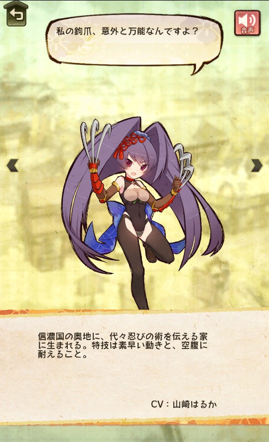 | 信濃国の奥地に、代々忍びの術を伝える家に生まれる。 特技は素早い動きと、空腹に耐えること。 |