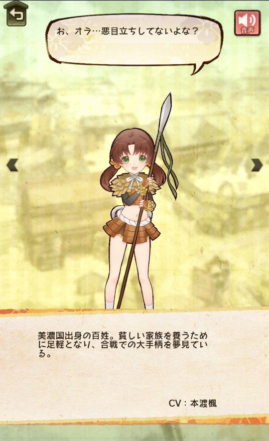 | 美濃国出身の百姓。 貧しい家族を養うために足軽となり、合戦での大手柄を夢見ている。 |